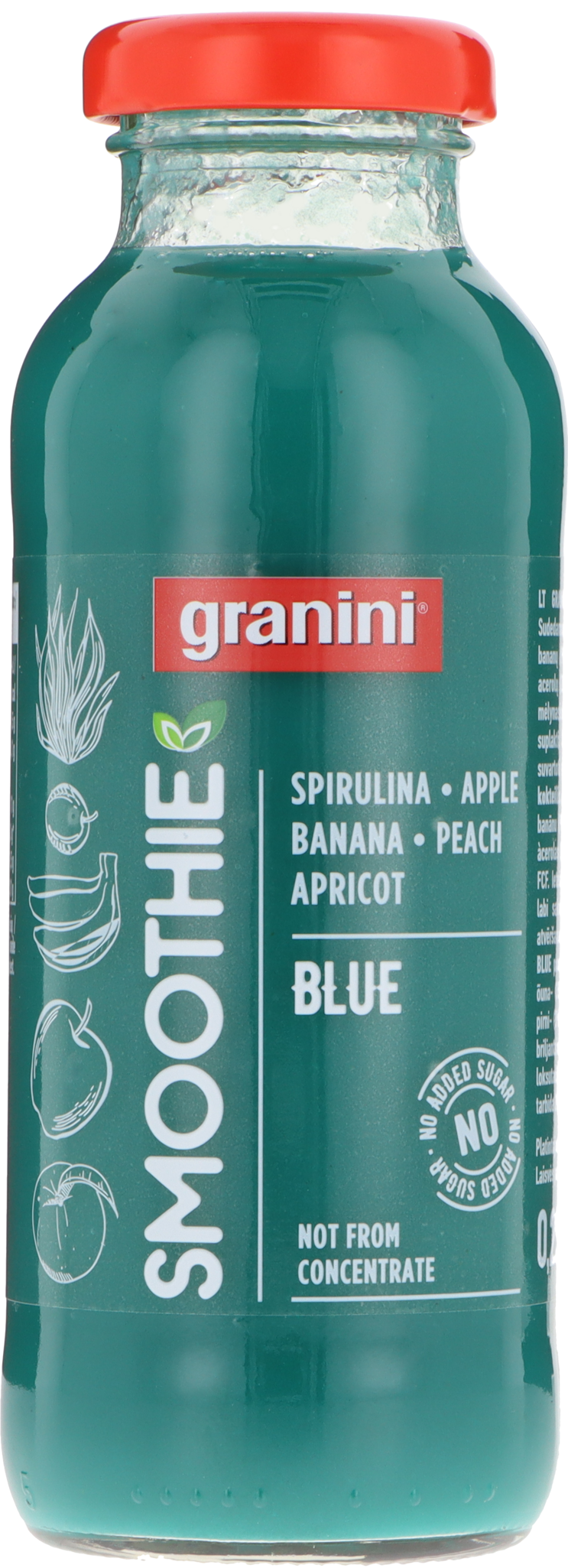 Õunad, banaanid, virsikud ja aprikoosid on ühinenud ainulaadseks puuviljakokteiliks ning kõige tipuks on lisandunud spiruliina. Proovi seda erakordset värvi smuutit. Loomulikult ei ole granini puuviljakokteili lisatud suhkrut ega säilitusaineid.